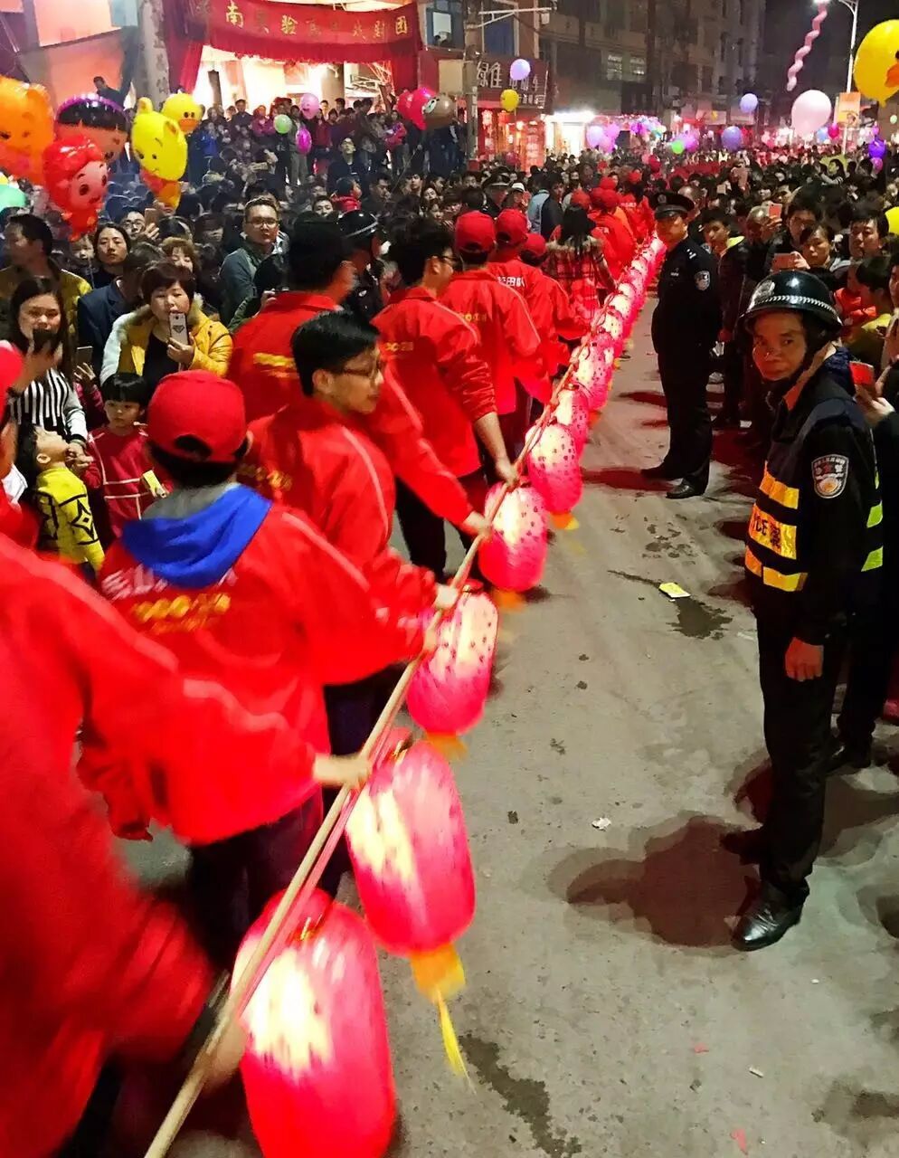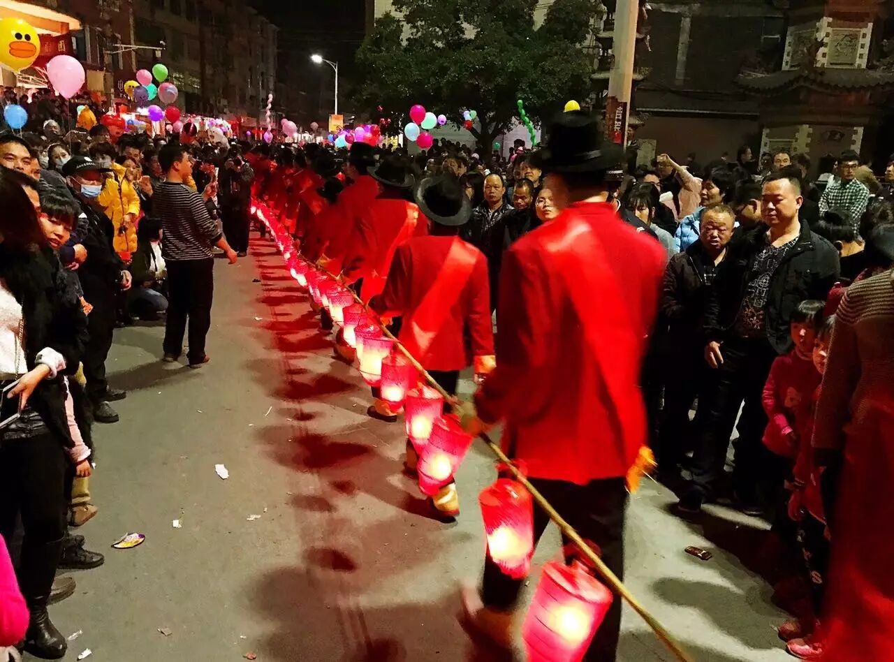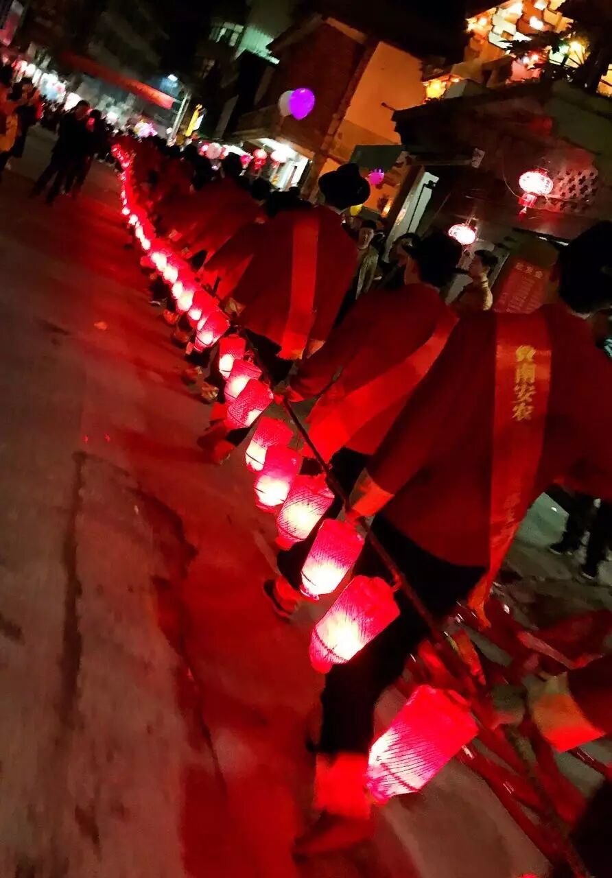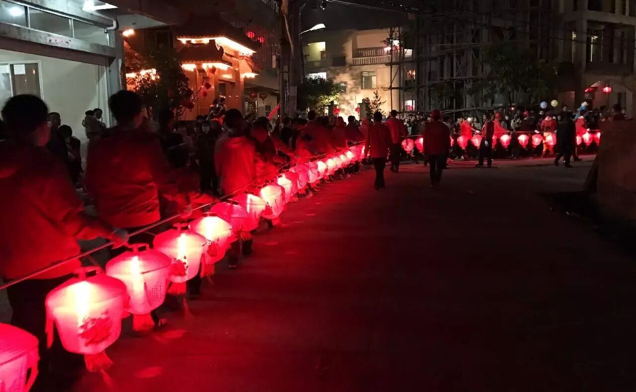 【英都乡讯原创,廖榕光、廖烨高报道】2月5日晚6点,英都镇董山昭惠庙隆重举行“拔拔灯”民俗活动。共有25个队伍参加,游灯队伍8000多人,规格是历年来最大的一次。25对“灯阵”形成了长达3公里的长龙,天公灯、走马灯、红枣灯、宫灯各种款式的花灯争奇斗妍,大鼓吹、车鼓舞、拍胸舞、“大摇人”、舞龙、弄狮等各种文艺表演节目穿插其间,游灯队伍所到之处,家家户户门前“出火囷”(燃烧篝火)迎灯,祈求风调雨顺,国泰民安、人丁兴旺、事业辉煌。整个活动将持续到子夜时分才告全部结束。